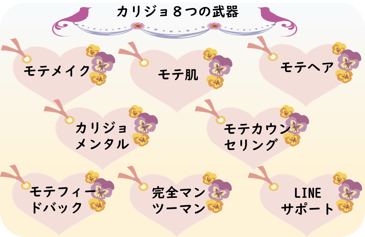 婚活プライベートレッスンでは、婚活ビギナー女性に必須の「モテ肌」「モテメイク」「モテヘア」そして「カリジョメンタル」をメインに合計8つの武器をみなさまにお授けいたしてます。